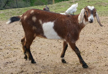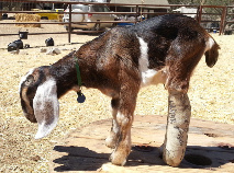 Breed Standard (from the MDGA website) American and Purebred Miniature Nubians The Mini-Nubian is a mid-sized goat being of mixed Nigerian and Nubian origin. It is known for being a graceful, elegant animal standing between 22-28 inches and comes in any color or pattern of short, fine, glossy hair. This mid-sized goat is know for its ease of milking; producing a high quantity and quality of milk whose butterfat yield is similar to that of the standard Nubian. Emphasis is placed on a structurally correct animal with well-attached udder that milks with ease. As this breed was originally designed for small farms and homesteaders who milk by hand and needed a smaller animal for handling and feeding purposes. The breed character setting the Mini-Nubian apart from other Mini's is a nose that is never dished, but straight to strongly convex (with the strongly convex being more desirable). And distinctive, long, wide, and pendulous ears that when held along the face reach the end of the nose. They should be held close to the head where they attach and then widen and flare out and forward to a rounded tip, making the classic "bell" shaped ear standard Nubians are so well known for. No part of the Mini-Nubian should be coarse, but instead dairy and refined (with masculinity for bucks); with soft supple skin and udders, strong correct legs, wide flat boning throughout, sharp shoulder blending into a long and graceful neck, and ample width and depth for kidding and milking purposes. Maximum height: Does 28” Bucks 29” Evaluation of Defects Moderate Defect: Straight face Disqualification: Upright ears |