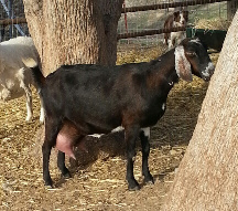 F5 Jardine Meadows Faith AMN03348 | ![]() | Mini Nubian "America" gave us our farm mascot, Pixie, as well as one of our strongest bucklings, Willie Nelson. | F5 5th generation mini-nubian Registered: MDGA Born: 03/24/2013 Sire: Blue Oak's Lazarus AMN01943 Dam: Blue Oak's Just a Rumor AMN01945 Color: Black and Chocolate with frosting ears and Swiss markings | |