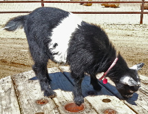 Pixie | ![]() | Mini Nubian Sweet bottle baby. Only 3.5lbs at birth, she is the new farm mascot. | F5 5th generation mini-nubian Registered: IDGA Born: 06-23-2014 Sire: F4 Cornerstone Farms Kaleidescope Dam: F5 Jardine Meadows Faith Color: White with gray and black markings. Price: Retained | ![]() ![]() |