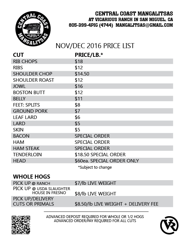 After much research, Mike and Christy aquired two gilts and a boar for breeding stock.  Their first litter of woolly piglets were born in June, 2015 and now the ranch has a rotation of approximately 30 market pigs growing at any given time. Mangalitsas are a slow-growth hog and take twice as long to grow to market weight as a typical commercial hog. This results is a deep red meat with marbelling throughout and a flavor like no other pork. Our pigs are raised on pasture and a special no-corn-no-soy-no-gmo feed. These special hogs are currently marketed toward restaurants and gourmets on the central coast and sold in shares before going to an approved USDA facility for processing. We twice annually produce approximately 16-20 market hogs per breeding.